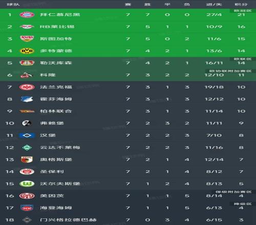 德甲第7轮结束了所有比赛,最新积分榜如下!