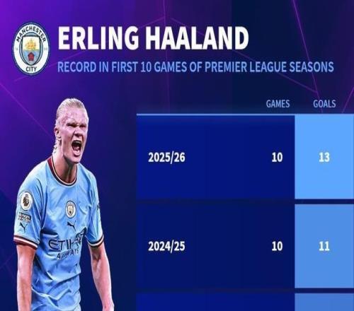 开局状态火热,哈兰德曼城生涯英超前10轮40场已打入50球